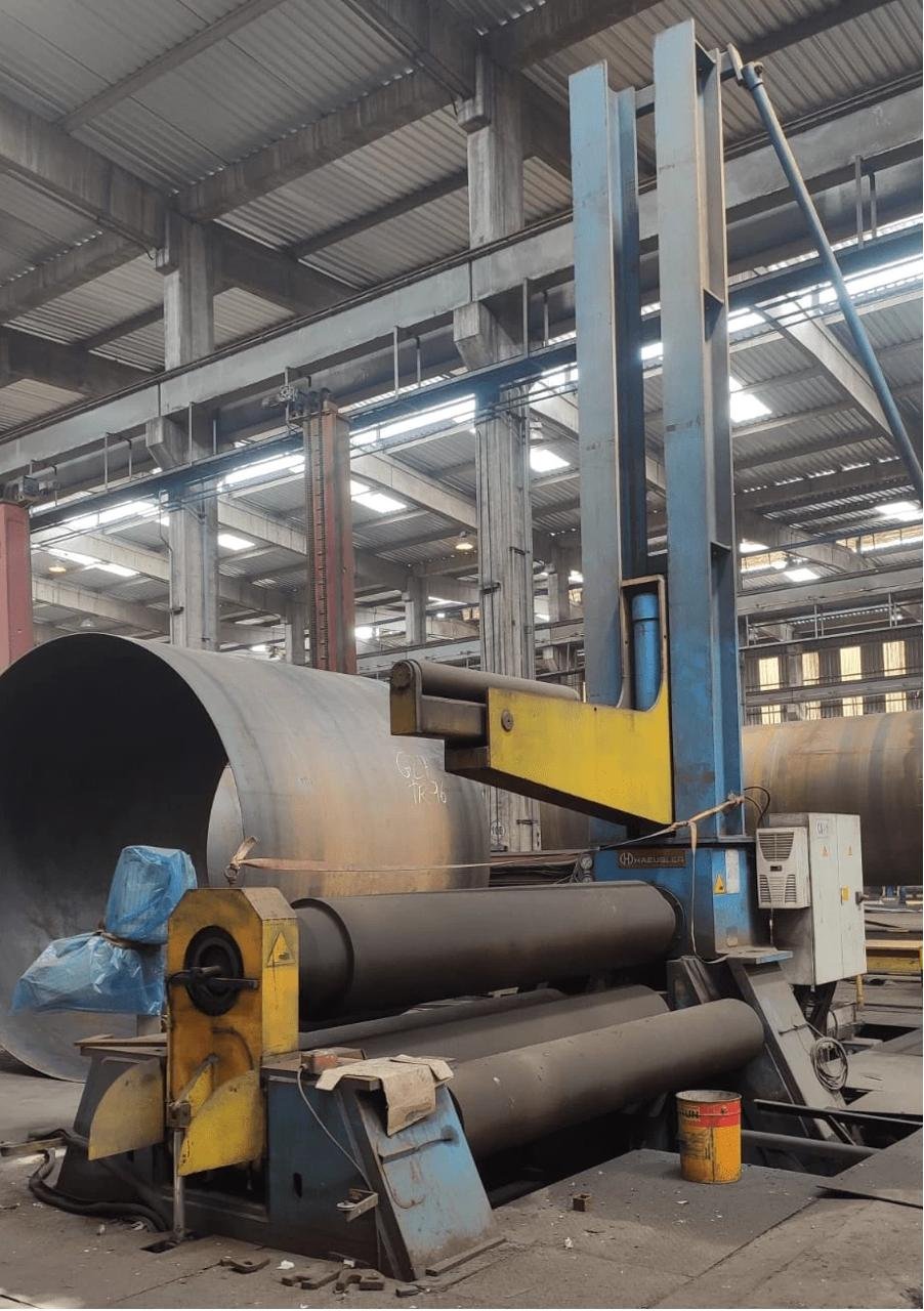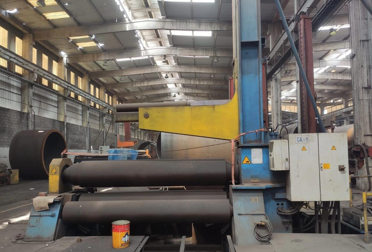 Possui capacidade para chapas de até 50/60 mm de espessura e 3.000 mm de largura útil, garantindo excelente desempenho na conformação de chapas grossas, produção de cilindros, tanques, vasos de pressão e estruturas metálicas de grande porte.